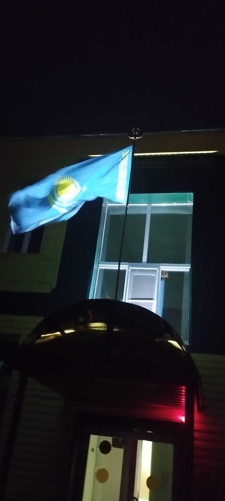 Қазақстан Республикасының мемлекеттік туы – ортасында шұғылалы күн, оның астында қалықтап ұшқан қыран бейнеленген тік бұрышты көгілдір түсті мата. Тудың сабының тұсында ұлттық өрнек тік жолақ түрінде нақышталған. Күн, оның шұғыласы, қыран және ұлттық өрнек бейнесі алтын түстес.